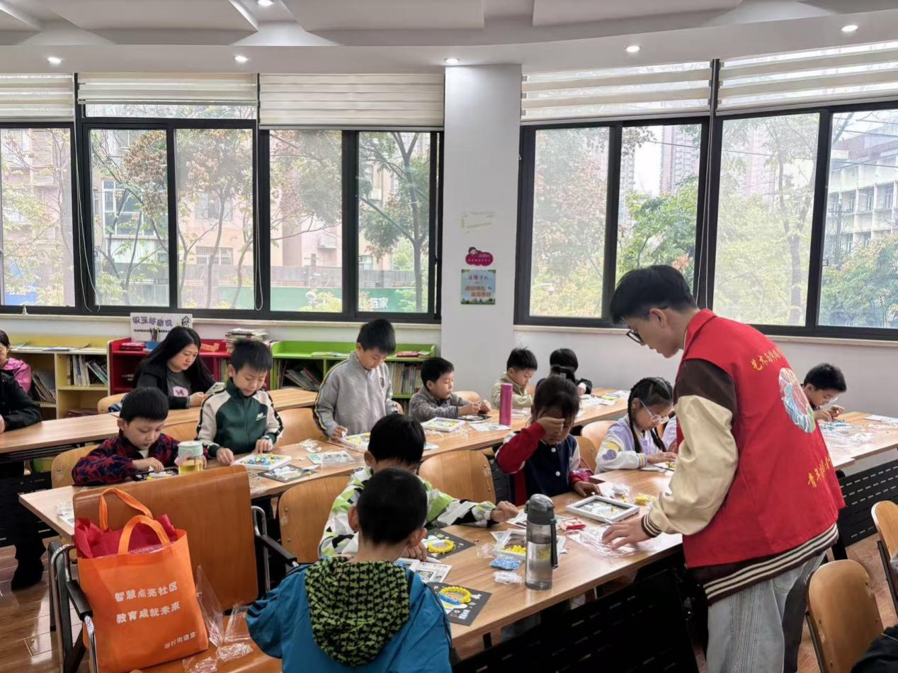 进入手工实践环节,小郑老师带领青少年制作宇航员创意贴画。志愿者团队首先协助小郑老师有序分发贴画材料包,随后主动围绕在孩子们身边提供帮助。遇到操作手法不正确的孩子,志愿者会轻轻引导调整,耐心纠正细节;面对有独特创意想法的孩子,志愿者则积极鼓励他们大胆发挥,设计专属的航天主题画面。志愿者们用耐心与专业,一步步帮孩子们把航天畅想变成了生动的手工作品,也让大家在实践中切实提升了动手能力。