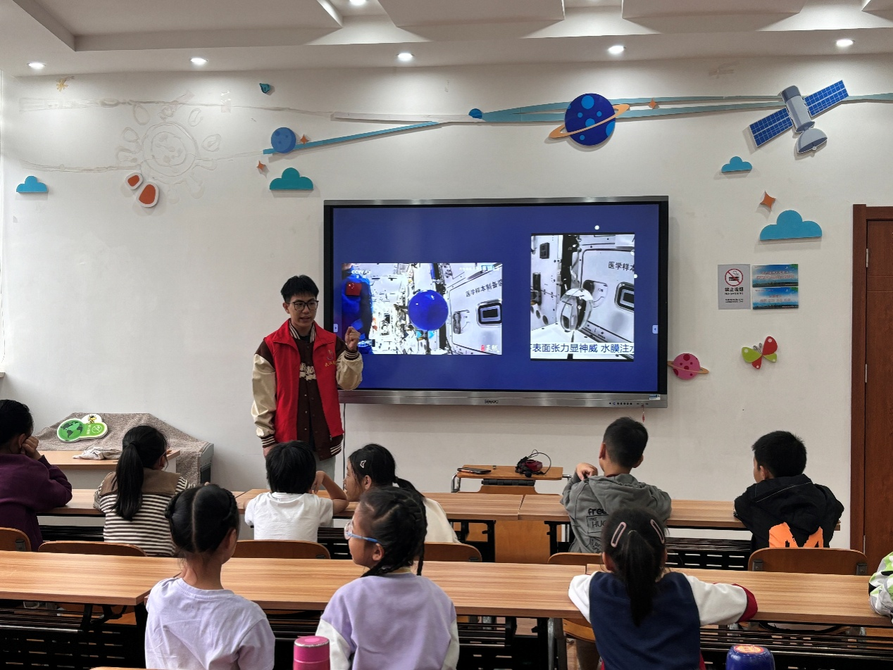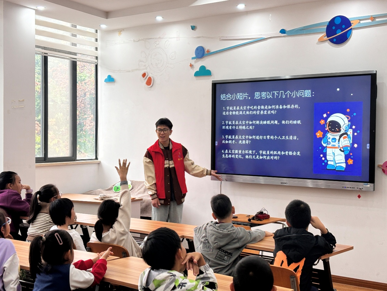 课堂上,志愿者小郑老师以 “悬浮太空小球” 魔术拉开序幕,瞬间抓住青少年的注意力。随后,他结合魔术提出问题:“小球为何不掉落?这和宇航员在太空的状态有何关联?” 紧接着,小郑老师播放趣味短片,用通俗易懂的语言解释 “太空失重” 概念,让抽象的航天知识变得生动可感。在讲清 “太空失重” 核心概念后,小郑老师进一步拓展科普内容,详细介绍宇航员的太空生活与面临的挑战。他既具体讲解了宇航员在太空的饮食、睡眠、个人卫生等日常事项,也深入阐释了太空失重环境对身体的影响、宇宙辐射防护措施以及极端温差的应对方法,全方位满足青少年对太空生活的好奇心。