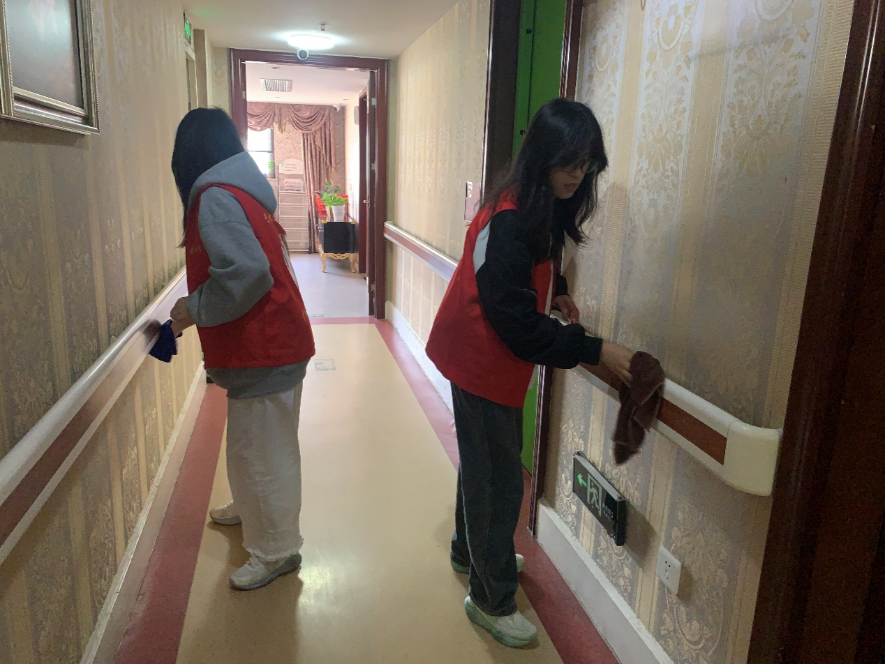 与此同时,卫生服务组的志愿者们拿起扫帚、抹布等工具,全身心投入到环境清扫工作中。他们有序打扫活动区地面、细致擦拭公共扶手、分类整理公共区域杂物,仔细地清理着每一个角落;发现部分老人的床具不稳,志愿者们还主动帮忙更换、调整,用利落的动作让养老院的环境更整洁、居住更安心,每一个弯腰清扫的身影,都传递着对老人的关爱与尊重。