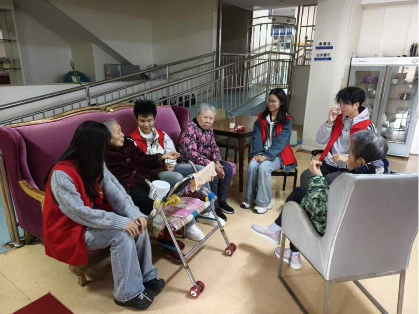 抵达养老院后,志愿者们在护理部自理区刘主管的统筹安排下,迅速分成“聊天陪伴组”和“卫生服务组”展开服务工作。聊天陪伴组的志愿者们主动围坐在老人身边,耐心倾听他们讲述过往岁月,从家庭琐事的温馨片段到人生旅途的生活感悟,志愿者们耐心回应、轻声交流。当得知部分老人喜爱唱歌,志愿者们顺势发起歌唱互动,经典老歌的旋律在活动大厅缓缓流淌,老人们跟着轻声哼唱,歌声与笑声交织成温馨的乐章。