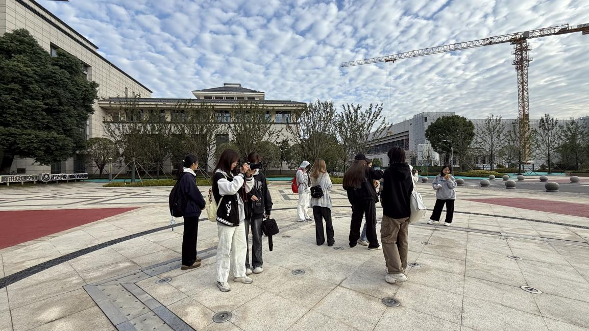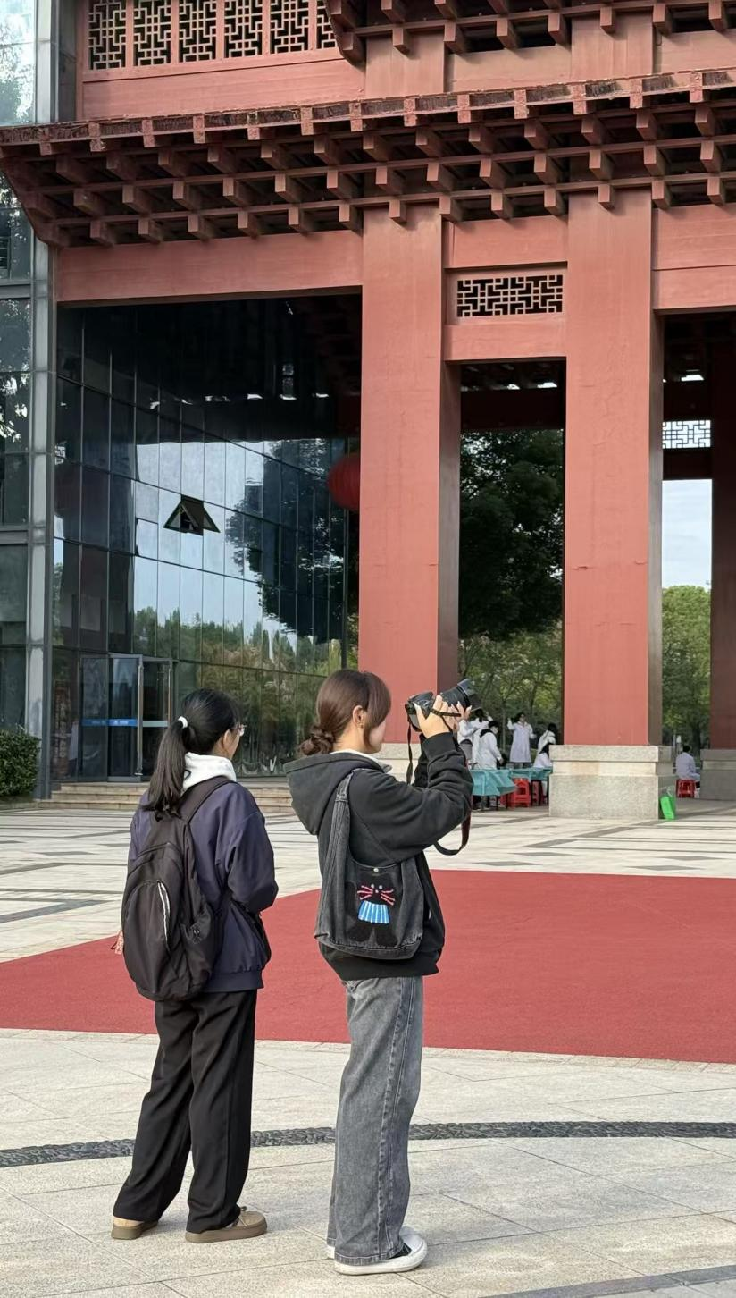 林荫道上,有同学蹲守在草坪旁,耐心等待朝阳穿过枝叶的瞬间,试图捕捉光斑洒落的动态画面;湖边栈道上,相机镜头对准湖面,记录朝阳在水波中形成的粼粼波光;教学楼前,同学们调整焦距,将建筑轮廓与初升朝阳纳入同一帧画面,用光影对比展现校园建筑的层次感。过程中,大家不时交流拍摄参数,分享构图思路——有人为了捕捉最佳光线,在原地等待近20分钟;有人为了找到独特视角,特意绕到校园僻静角落,每一份专注都只为定格晨光中最动人的瞬间。