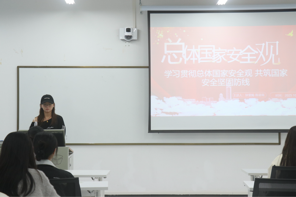 随后,李甜甜以“学习贯彻总体国家安全观,共筑国家安全坚固防线”为主题,结合当前国际国内安全形势,系统阐释了总体国家安全观的核心要义——“以人民安全为宗旨,以政治安全为根本,以经济安全为基础,以军事、文化、社会安全为保障,以促进国际安全为依托”的五大要素,以及“统筹发展和安全、外部安全和内部安全”等五对关键关系,她结合校园场景举例,比如在组织线下活动时如何平衡活动效果与防疫、消防安全,在网络社交中如何辨别虚假信息、防范意识形态风险,为学生干部提供了可操作的工作方法。