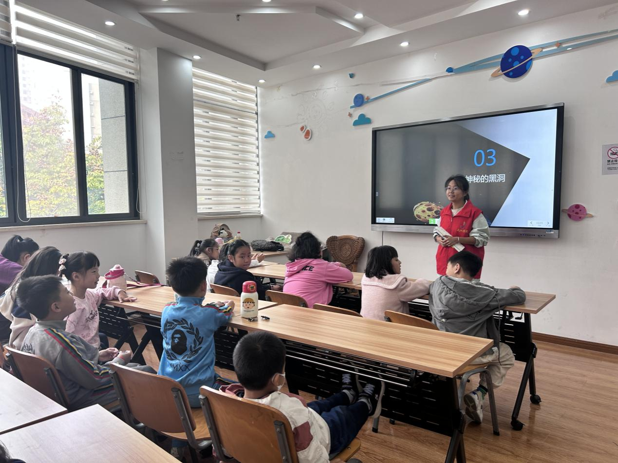 活动伊始,志愿者以“宇宙三大奥秘——探索未知的边界”为主题展开科普授课。从“什么是宇宙”的宏观概念引入,到太阳系八大行星的特色讲解,再到“神秘的黑洞”和“暗物质”的趣味科普,志愿者借助精心制作的PPT,用通俗易懂的语言和生动的宇宙图景,将浩瀚宇宙的奥秘拆解成孩子们能理解的知识碎片,在他们心中播下了探索星际的种子。课堂上,孩子们眼神中闪烁着好奇的光芒,踊跃提问,与志愿者积极互动,现场氛围热烈而温馨。