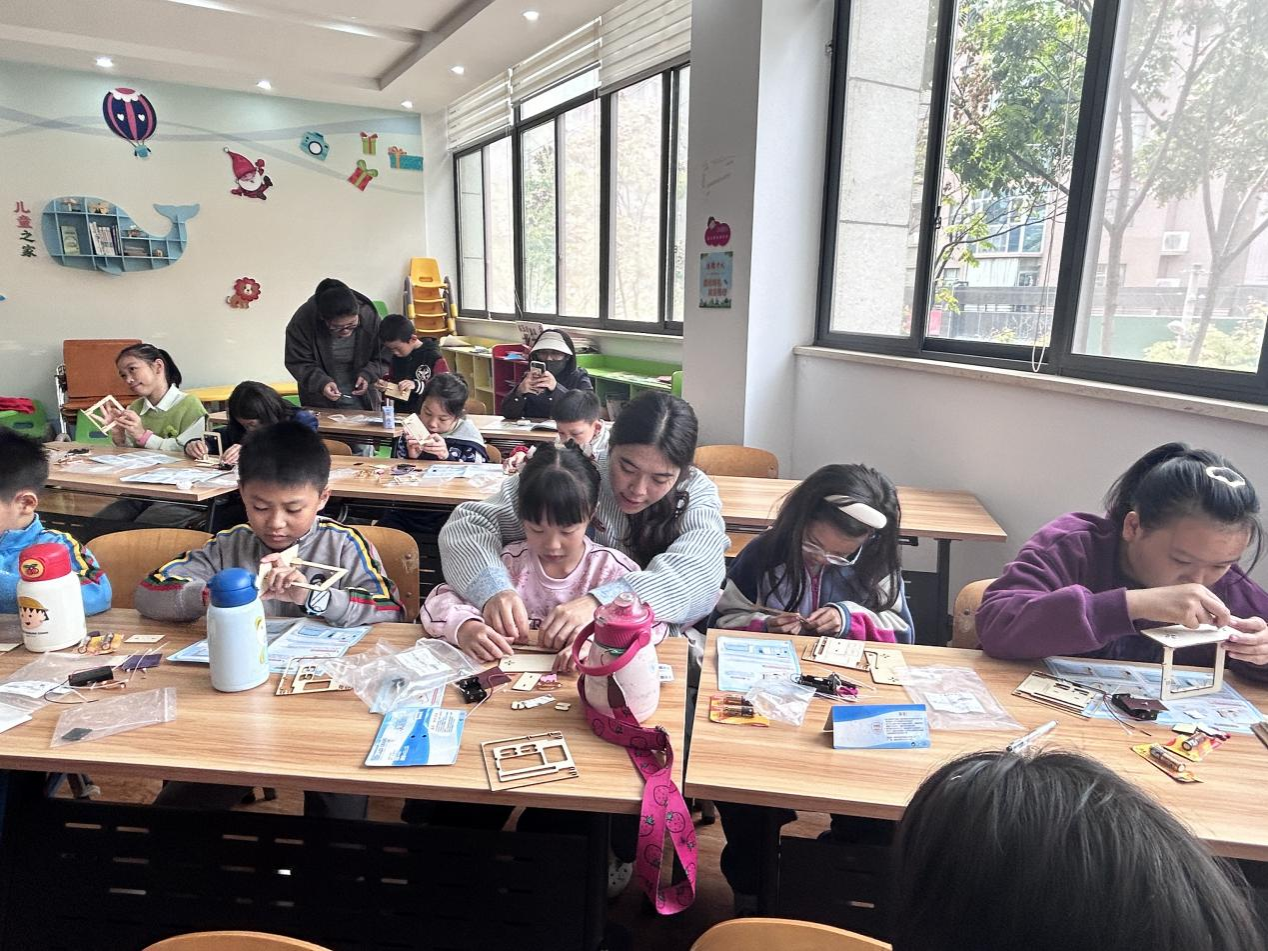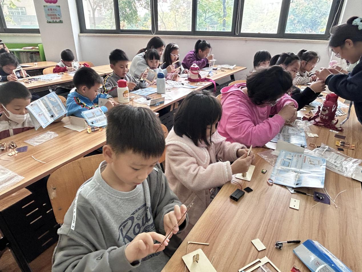 科普授课结束后,志愿者带领孩子们开展了电磁秋千手工制作课程。在志愿者的耐心指导下,孩子们小心翼翼地组装电路、拼接支架,专注地将一个个零件变成了能“摇摆”的电磁秋千。手工制作过程中,孩子们不仅锻炼了动手能力,更在实践中直观理解了电磁原理,将科学知识从书本转化为可触摸、可操作的趣味体验。