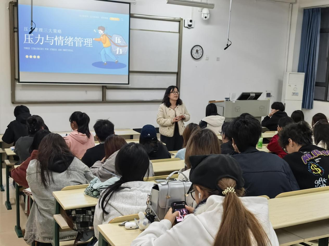 在压力来源探讨环节,李老师引导同学们结合自身经历,分享了来自学业竞争、人际沟通、家庭期待、自我认同等方面的压力。随后,李老师围绕PPT中“压力管理三大策略”展开详细讲解。针对不同情绪需求,李老师还分享了“音乐处方”:疲劳时聆听《水上音乐》,缺乏自信时感受《命运交响曲》,焦虑时沉浸《春江花月夜》,让音乐成为情绪调节的“良药”。互动环节中,同学们现场实践腹式呼吸法,交流减压小技巧,氛围热烈而温馨。