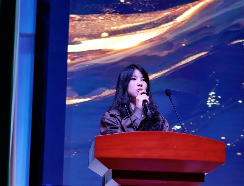 曹书记的殷切嘱托犹在耳畔,张倩文作为上一届学生会副主席分享了任职的成长与感悟,她以“感恩、成长、传承”为关键词,细数了与各部门伙伴并肩协作、攻克难关的珍贵点滴,从活动策划到落地执行,从团队磨合到默契相守,每一段经历都饱含深情。“学生工作的核心是服务,底色是担当。”她寄语新一届成员,既要接过前辈手中的“接力棒”,传承严谨务实的工作作风,更要敢于突破、大胆创新,在新的征程上书写属于艺传团学的崭新篇章。同时,她向学院领导老师的悉心指导与伙伴们的一路相伴表达了衷心感谢,真挚的话语赢得了现场阵阵掌声。
