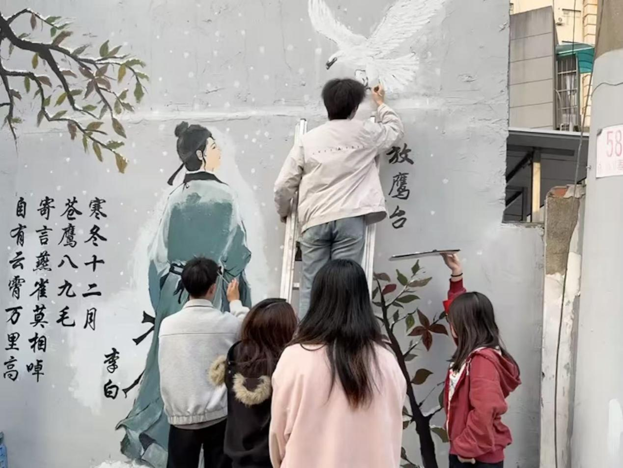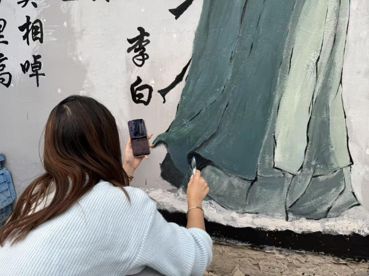 下午 2 点钟,志愿者团队携带颜料、画笔、调色盘等绘画工具抵达现场,在简单的分工协调后,大家迅速投入工作。此次修缮活动针对性极强,重点聚焦墙面原有墙绘中受损严重的叶子图案与李白人像两大核心部分。由于长期暴露在户外,这些图案出现了颜料脱落、线条模糊等问题,影响了整体美观与文化表达。