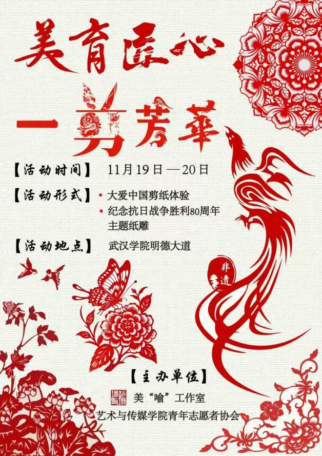 一张红纸藏古韵,一纸一剪传文脉。11月19日至20日,武汉学院美“喻”工作室主办的“美育匠心·一剪芳华”非遗剪纸体验活动在明德大道顺利举行。活动以千年剪纸艺术为载体,设置传统剪纸创作和抗战胜利80周年纸雕拼刻两大核心环节,让学子在指尖实践中感受非遗魅力、厚植家国情怀,实现以美育人目标本次活动累计收到236件作品。
