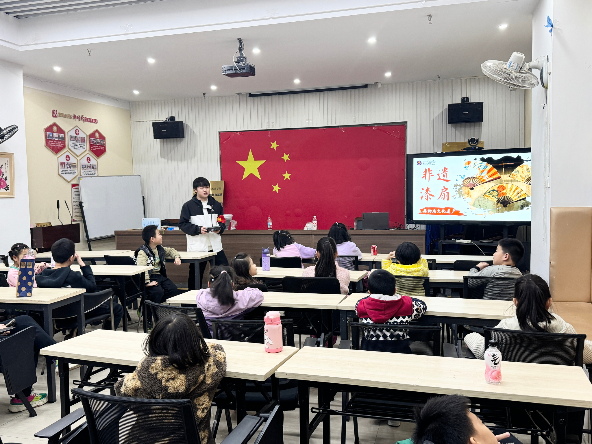 活动中,主讲老师魏思豪,用生动有趣的语言,向孩子们介绍了漆扇的历史渊源与工艺特色。“漆扇技艺起源于中国古代战国时期,距今已有千年历史,它不仅是实用的生活用品,更是承载着中华美学精神的艺术品。”他一边细心地蹲在教室中央示范漆扇的制作,一边向孩子们讲解文化内涵。