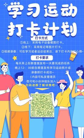 三.每天早上在群里发布一天要完成的任务,晚上12:00前在群里发布学习运动照片或者录像即打卡成功(提倡与小伙伴们组队打卡)。