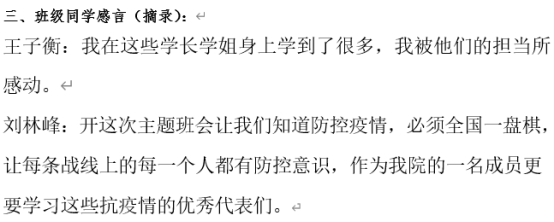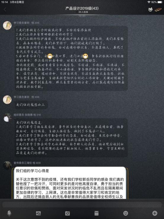 随后,同学们组织学习了,郭岳、刘智威、高仁俊等榜样的先进事迹,环艺1904班的刘林峰同学说道,“开这次主题班会让我们知道防控疫情,必须全国一盘棋,让每条战线上的每一个人都有防控意识,作为我院的一名成员更要学习这些抗疫情的优秀代表们。”