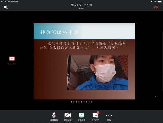 阳春三月,春暖花开,本该是结伴出游,享受大好春光的时节,天色却在新冠肺炎的笼罩下显得有些灰暗。疫情来袭,人人惶恐,武汉学院却涌现出了不少热于奉献、勇于奋斗的先进师生,起到了榜样带头作用。为增强全院师生防范疫情的意识,艺传学院于2020年3月8日下午开展了以“弘扬战疫精神,汲取榜样力量”为主题的线上班会。