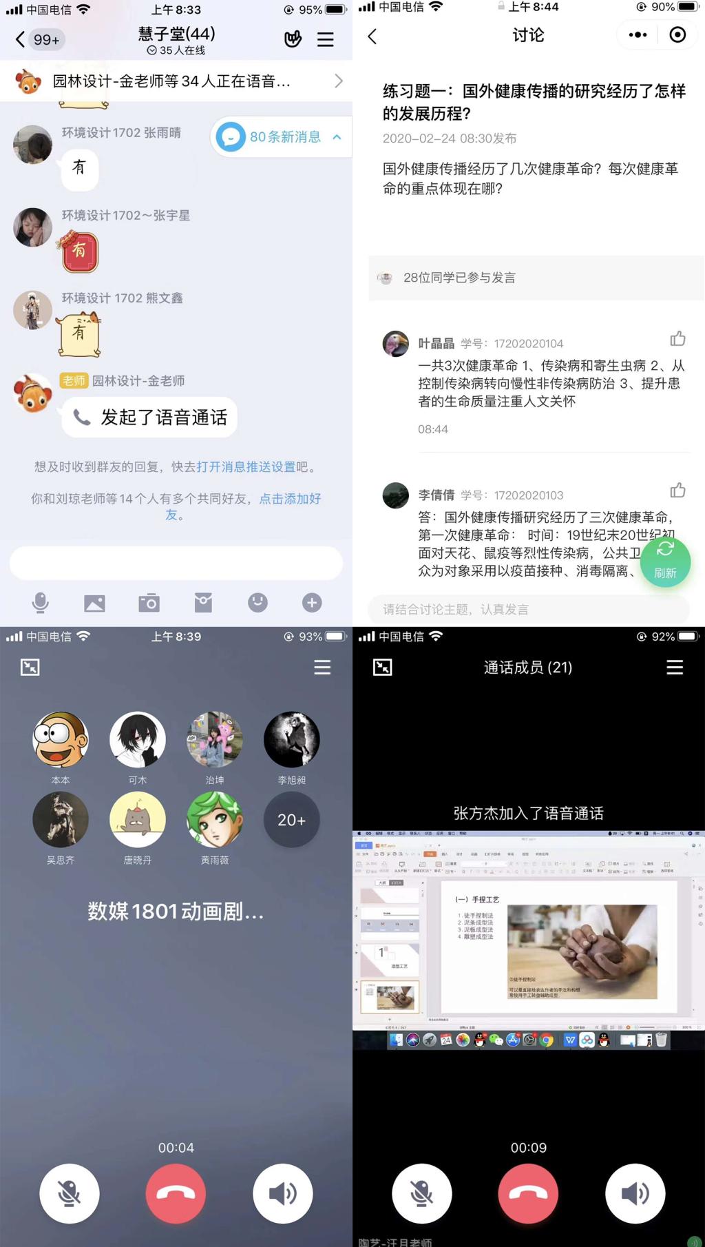 环艺1801班《设计心理学》课程的朱永红老师、环艺1702班《园林设计》课程的金慧老师、环艺1903班《陶艺》课程的汪月老师,采用了QQ在线直播,并且伴随PPT教学,形式清晰直观;网媒(大楚)1701班《新媒体文化》课程的吴波老师、网媒1902班《数字图像处理》课程的易文飞老师,采用中国大学MOOC平台和超星平台授课,师生在网上教学答疑,互动讨论,积极性非常高涨。