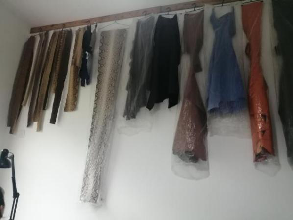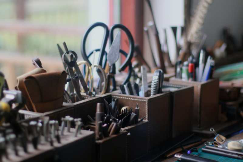 之后来到朱洪军先生的皮料展示区及工作区域,由于朱洪军先生坚持的是私人定制的手工皮具,所以在工作室内,我们可以看到大量的皮革材质,材料种类高达上百款,主要有蟒蛇皮、鳄鱼皮、鹿皮、鸵鸟皮、珍珠鱼皮、海豹皮、蜥蜴皮、鸵鸟腿皮、牛皮等。在工作室中,我们也可以看到朱洪军先生没有完成的产品,在这些半成品中,我们可以看到朱洪军先生制作的皮包,内部与外部都是皮料制作而成,不会出现内胆损坏的问题。来到工作台便看到朱红军先生及夫人在制作皮具的过程中所用到的工具,朱洪军先生的工具多达上百种,有市面上常见的皮具制作工具,也有很多工具是朱洪军先生自己制作出来的工具,由此可见,朱洪军先生在皮具制作方面的专业性与扎实的技术能力。