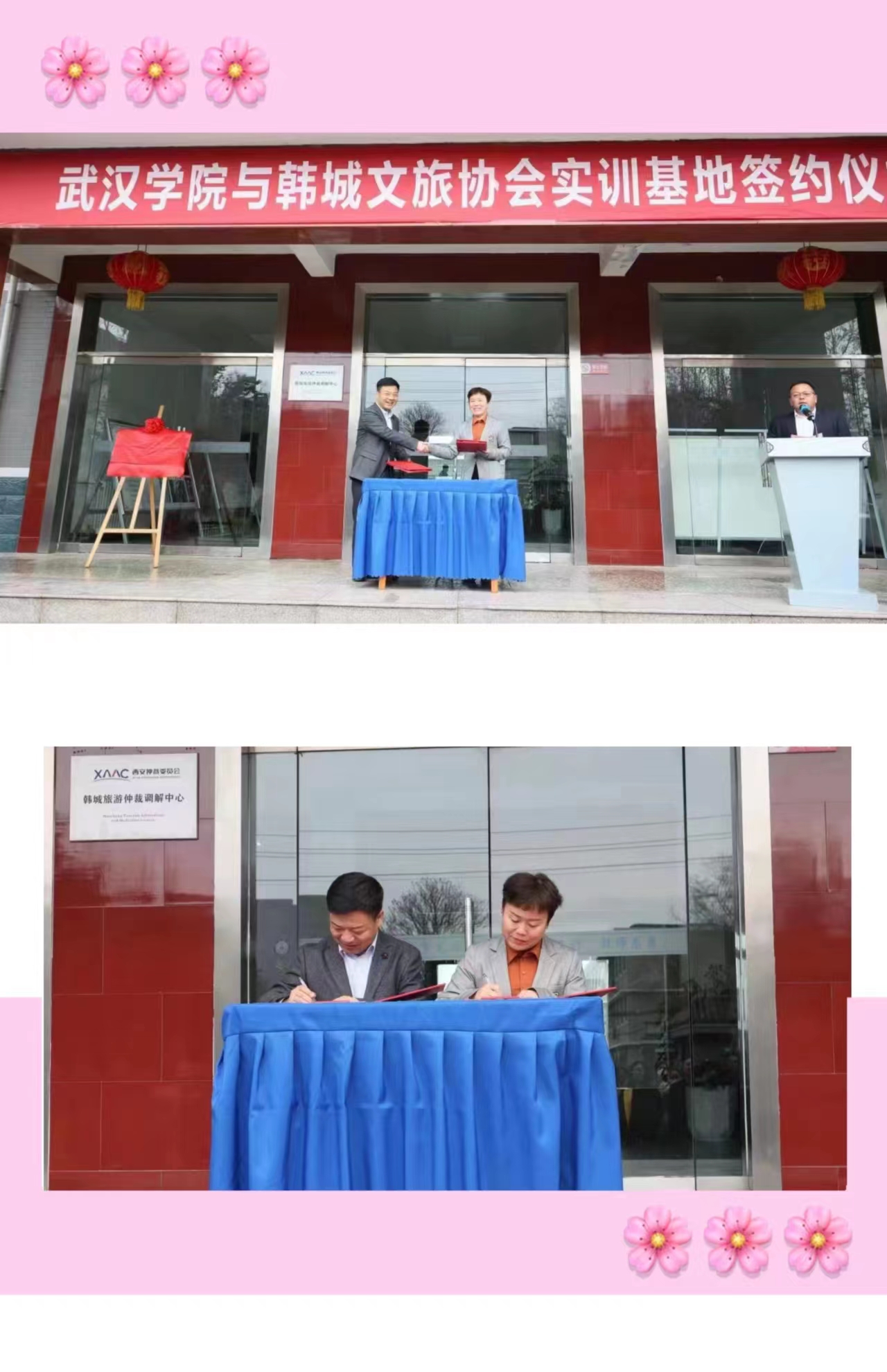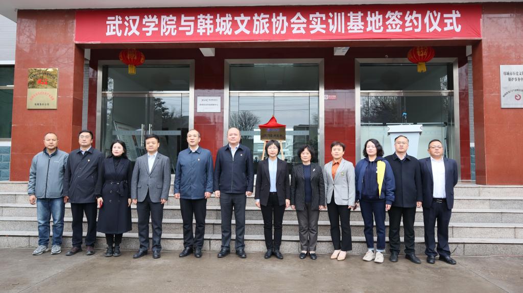 2023年4月4日,武汉学院与韩城文旅协会共建实习实训基地签约仪式在古城书院街文旅协会大院举行,得到韩城市政府、韩城市文化旅游教育部门的大力支持。市政府副市长马文娟、斯宏浩,市文化和旅游局局长党辉、景区管委会副主任王惠,武汉学院副校长郑祝君、教务处副处长谢忠琴,艺术与传媒学院副院长欧阳慧等领导出席签约揭牌仪式。