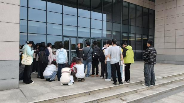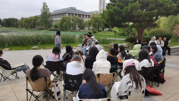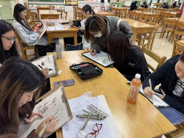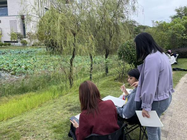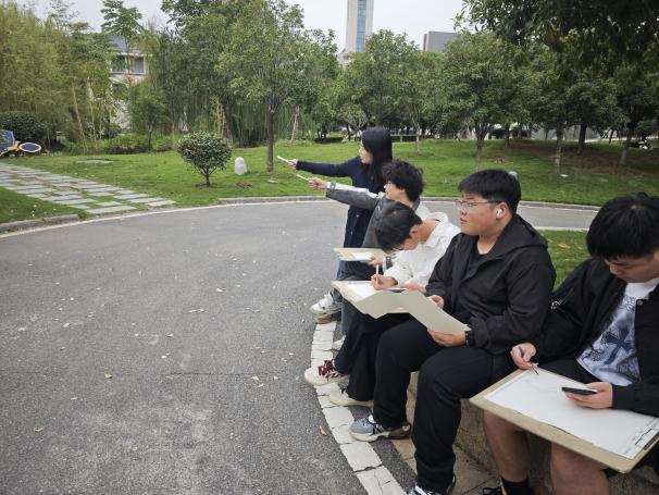随后,学生们在各班教师的带领下,前往校园内的各个写生点。图书馆前,学生们在教师的指导下,捕捉光影变化,学习如何巧妙表现画面的空间层次感;明德湖畔,围绕亭台水榭,教师耐心讲解构图技巧,引导学生发现自然与人文的和谐之美;现代教学楼前,教师结合建筑线条,解析美学原理在设计中的应用,激发学生的创新思维。