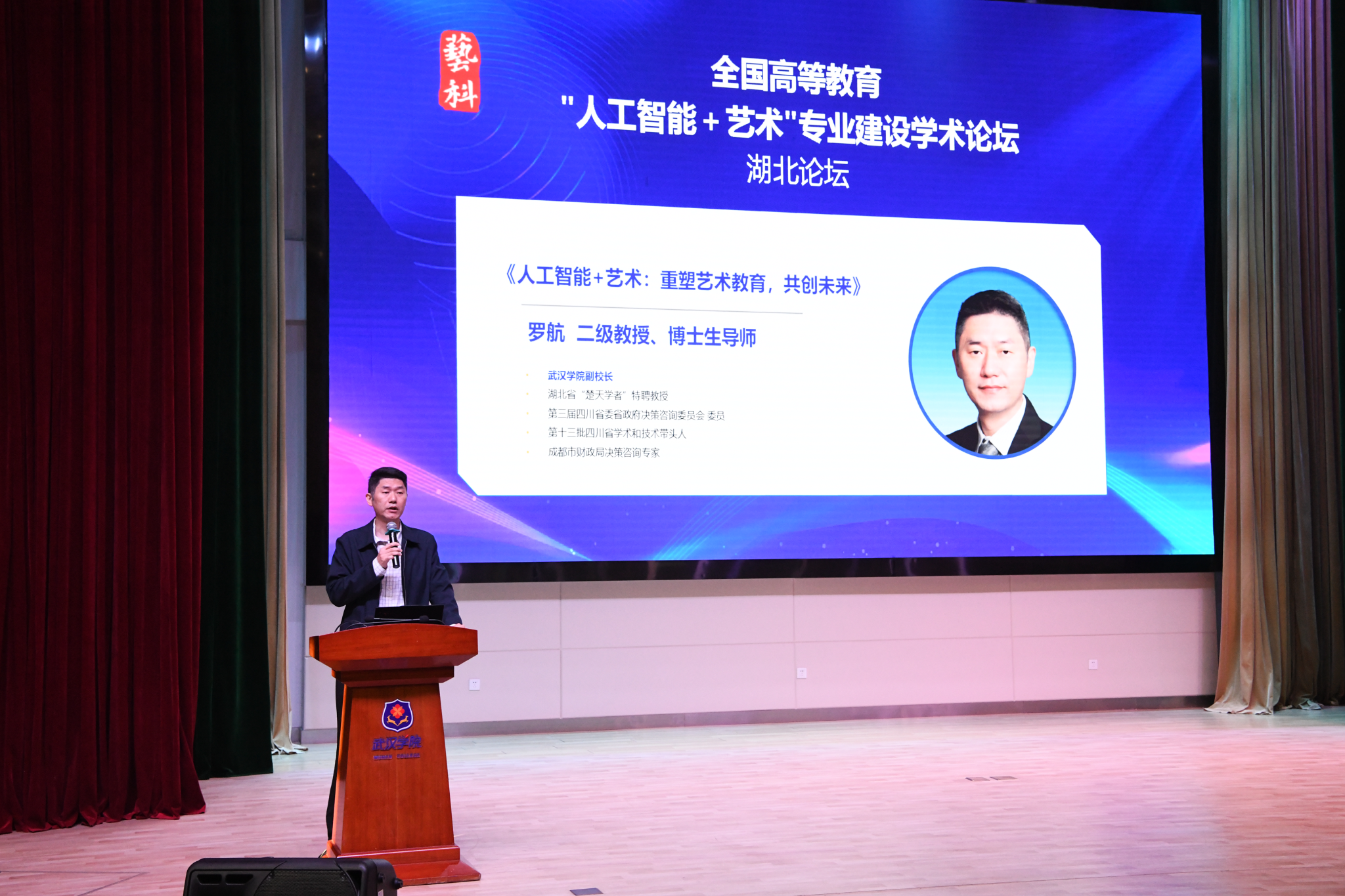 论坛开幕式由武汉学院艺术与传媒学院院长欧阳慧教授主持。武汉学院副校长罗航教授在致辞中强调,专业是高校立德树人的基本载体,武汉学院高度重视学科交叉与产教融合,与腾讯、华为、中软国际等企业共建产业学院,开设“腾讯班”“华为班”等特色项目,推动“学历+证书”双轨培养。近年来,学生在学科竞赛与创新创业项目中屡获佳绩,展现了“人工智能+艺术”融合育人的阶段性成果。