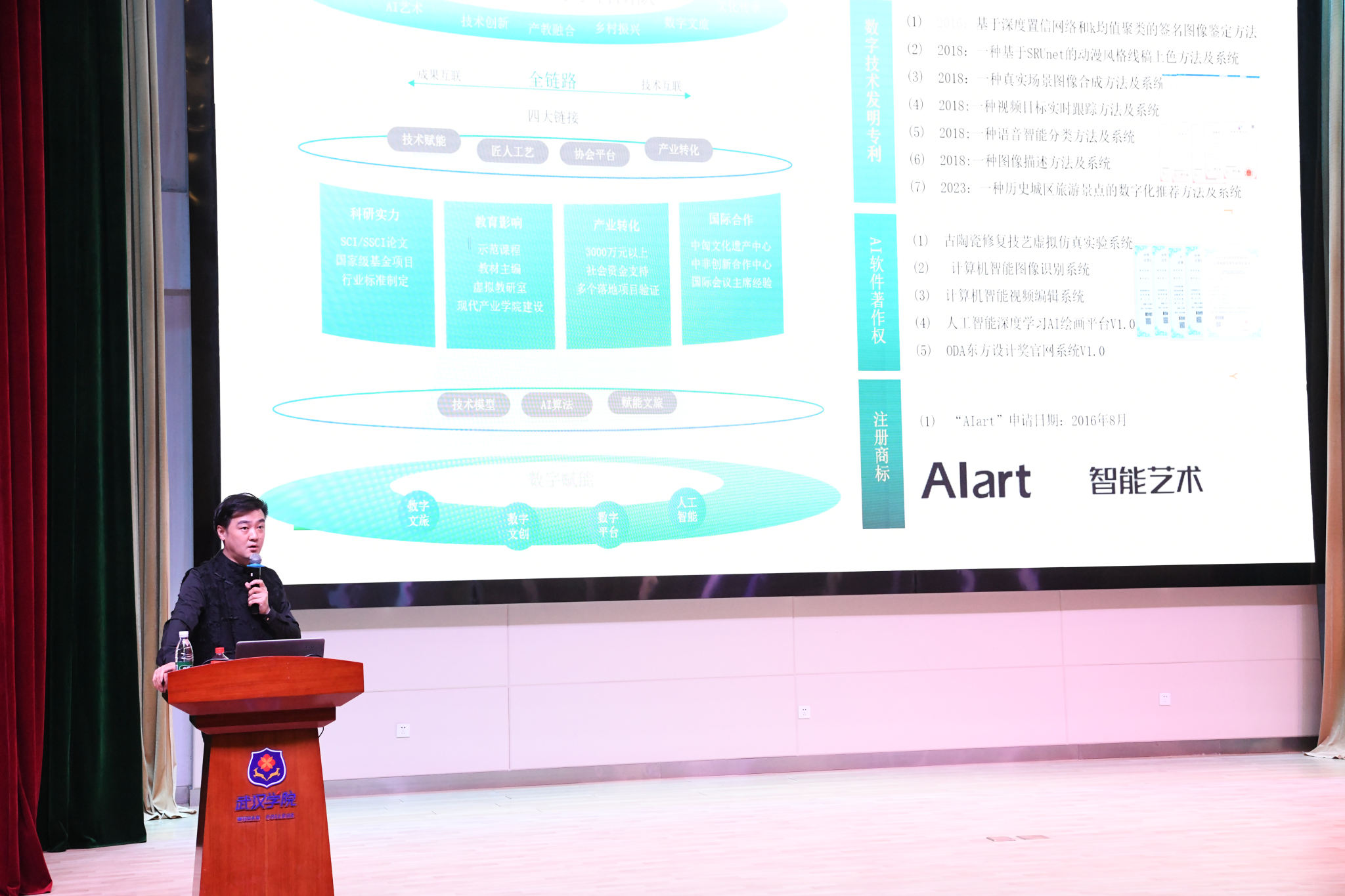 湖北工业大学艺术设计学院院长饶鉴教授分享了该校在智能设计教育领域的实践经验,提出"AI赋能、设计驱动"的新型教学模式,强调艺术设计教育必须紧跟技术变革,培养创新型复合人才。