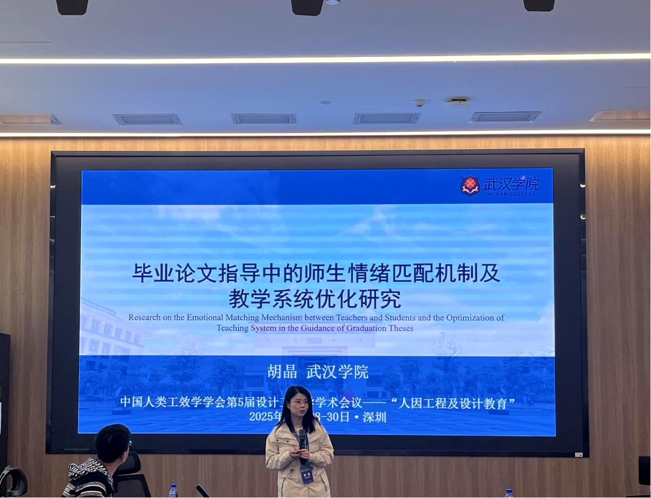 2025年11月28-30日,中国人类工效学学会第五届设计工效学学术会议在深圳技术大学成功举办。本次会议汇聚了来自全国各地的专家学者,共同探讨人因工程与设计领域的发展动态和前沿问题。武汉学院艺术与传媒学院胡晶副教授在会议上作了关于《毕业论文指导中的师生情绪匹配机制及教学系统优化研究》的报告,受到与会者的广泛关注。