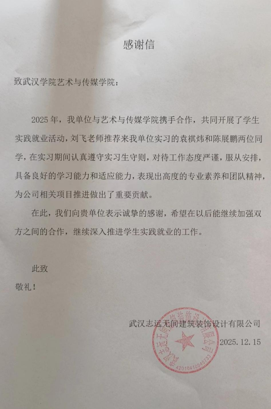 2025年12月15日,艺术与传媒学院刘飞老师前往武汉致远无间建筑设计装饰有限公司进行实习中期检查,本次检查旨在全面了解学生在实习期间的工作、生活和学习状况,帮助学生解决实际问题,为学生就业提供切实的助力。