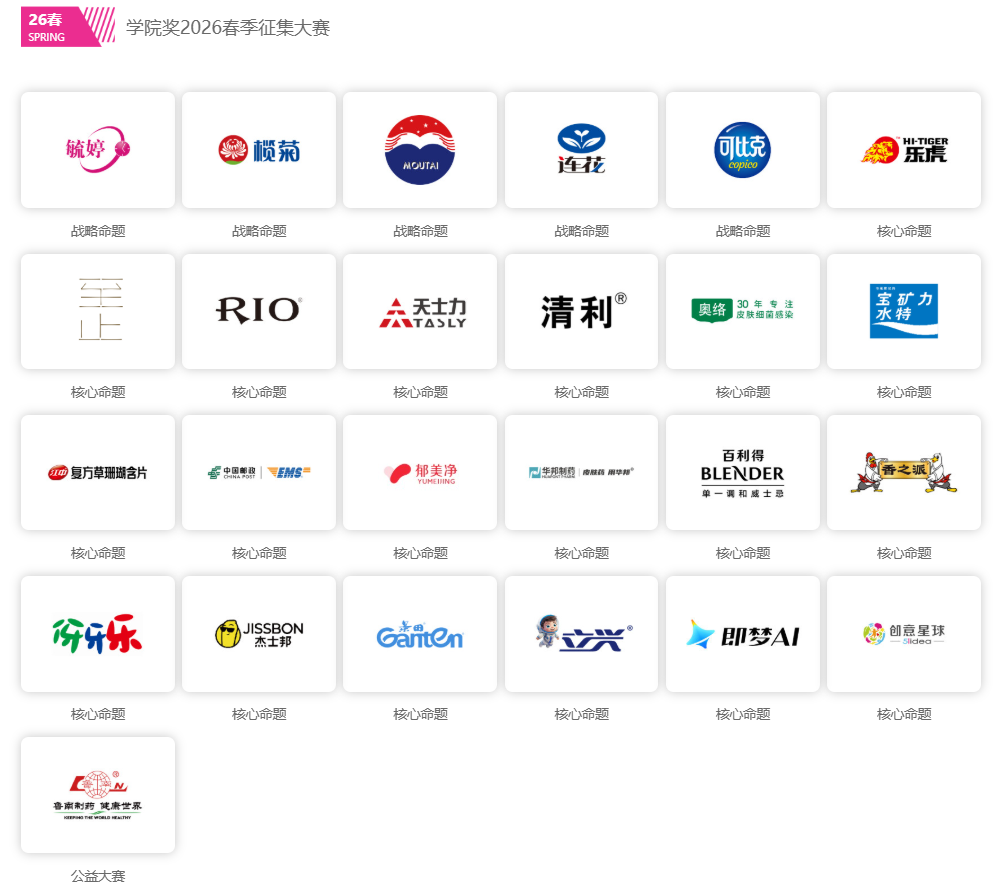 根据官网公布的信息,截至目前,学院奖2026年春季征集大赛已发布5项战略命题、19项核心命题和1项公益大赛,比赛项目主要涵盖平面类、设计类、视频类(含影视广告、微电影、短视频等)、策划类、文案类(含广告文案、种草图文等)、传播类等多个竞赛类别。命题来自毓婷、榄菊、茅台、莲花、可比克、乐虎、至止、RIO、天力士、清利、奥洛、宝矿力水特、江中、中国邮政、郁美净、华邦制药、百利得、香之派、伢牙乐、杰士邦、景田、立兴、即梦AI、创意星球、鲁南制药等多数十家知名企业或品牌。除赛事组委会官方的奖项评审之外,部分命题还提供丰厚的企业奖项和奖金,以鼓励全国大学生积极参赛。本次赛事也是首次有AI类主体直接参与命题。