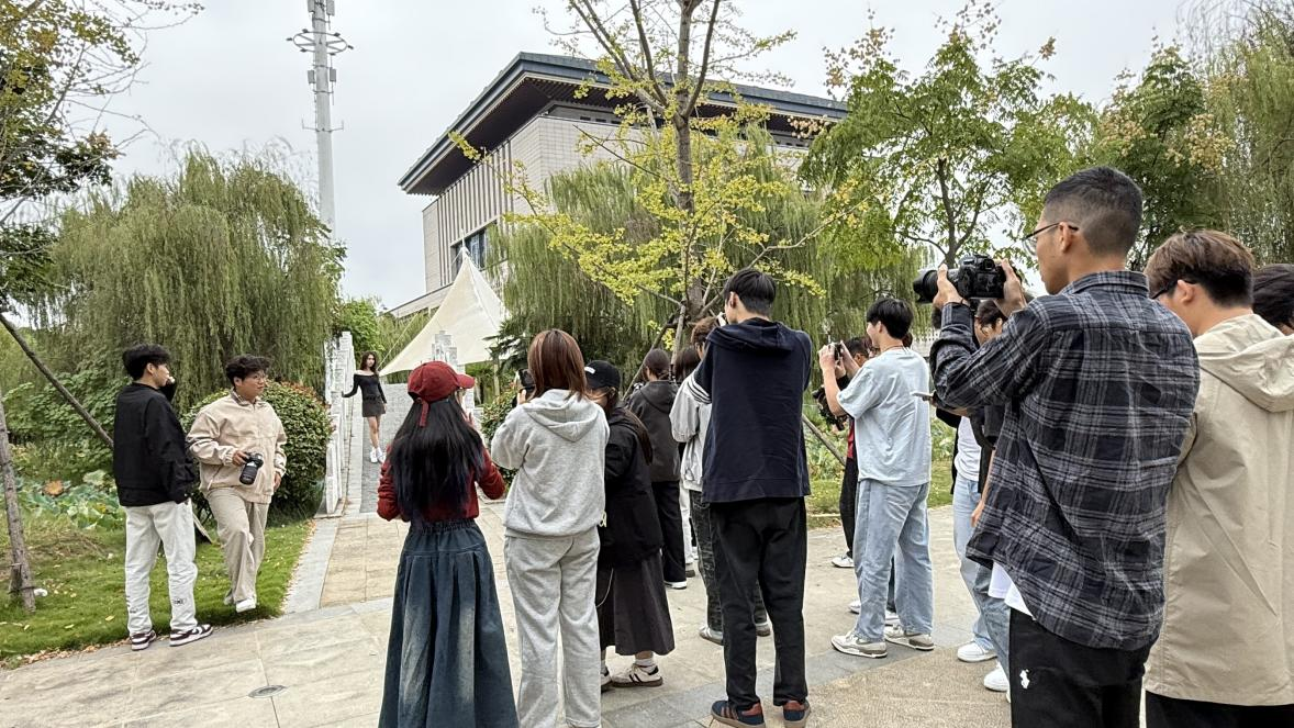 理论“充电”完毕后,同学们跃跃欲试,根据个人兴趣挑选了从轻便微单到专业全画幅单反等各式设备。实践拍摄如火如荼地展开,几名由学生担任的模特穿梭于林荫道、图书馆前和海棠花下,为同学们提供了绝佳的拍摄对象。顷刻间,校园的各个角落都布满了专注创作的“摄影师”身影。他们或蹲或站,调整角度,捕捉光影,将课堂所学的构图、用光技巧应用于实践。企业指导老师和专业任课教师则化身“移动顾问”,穿梭于各组之间,及时解答同学们在摄影在实践中遇到的各种问题。