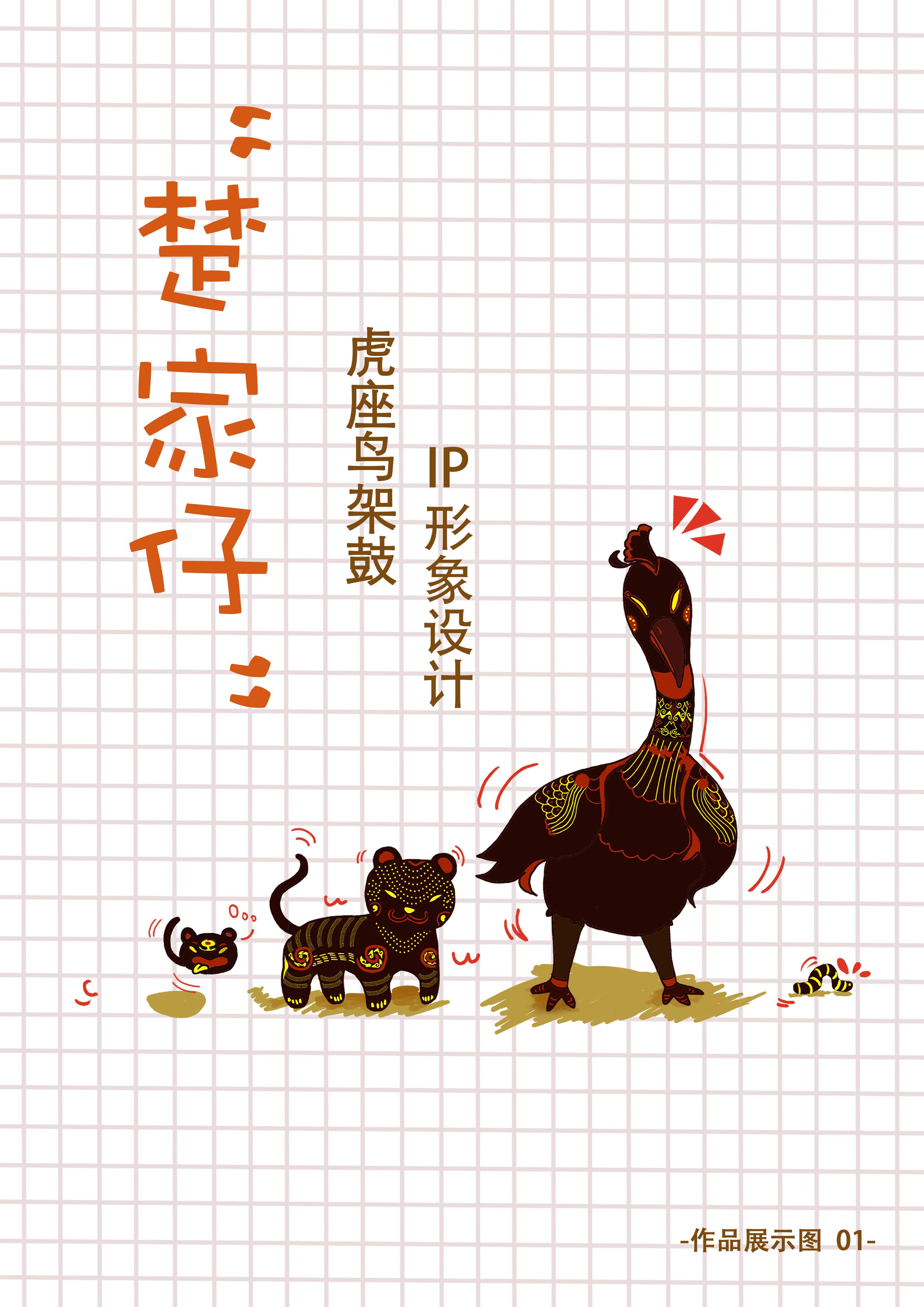 在漫画插画组中,由卢春梅老师和王磊老师带队指导,夏雨点与陈叶千子同学创作的作品《“楚家仔”虎座鸟架鼓》IP形象设计,为充分展现虎座鸟架鼓的独特形象,展现楚文化独特魅力,特意在简化整体形象的基础上最大程度保留形体特征,使之有趣而不失原型,可爱但不显得稚气。